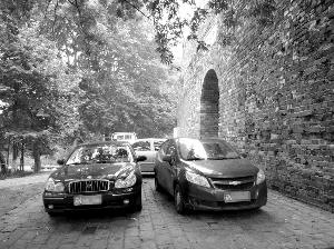 前天,市民段先生来到龙蟠路上的神策门公园游玩,当他想进入公园内的城门里游览时,却被工作人员告知,当天不能参观,就算买门票也不可以。吃了闭门羹,段先生有些扫兴,然而更让他不能接受的是,城门内外当时停了不少车。“国家文物保护单位的石碑就在城门口,那里却成了停车场,真是太不像话了。”段先生说。