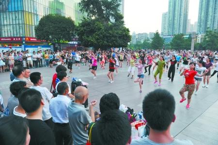 昨日晚上7:30,商报记者来到观音桥步行街广场。“你是我的小呀小苹果,怎么爱你都不嫌多……”《小苹果》的旋律一响起,广场上的大妈们欢快地跳了起来。交臂,甩臀,旋转,抖肩……记者在现场看到,70多人随着《小苹果》欢快旋律起舞,动感的舞姿让周围过路人也忍不住跟着摆动身体。