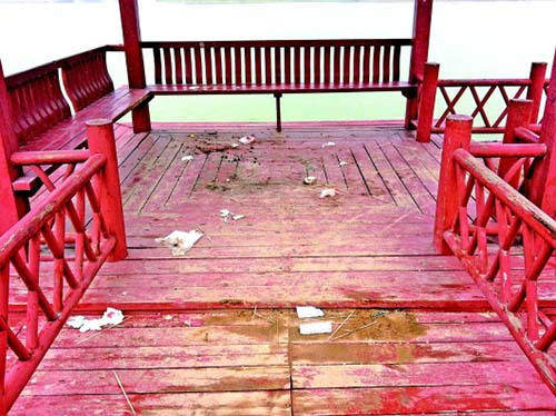 6月11日上午10时,记者来到位于整个澄波湖风景区东南侧的九曲亭桥,垂柳在微风中摇曳,湖中碧波荡漾。但当走到中间亭子时,映入眼帘的是满地的垃圾,地上到处是塑料袋和卫生纸,瓶盖和火腿肠包装袋也零零散散;原本整洁的座位上散布着吃串的签子,在不远处的亭子一角还有零碎的木炭。
