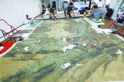 按照规范,这幅古画已经完成了除尘、消毒、颜色加固、揭背、补绢、托心的步骤,全色之后,还需要平展拼缝、上墙、防虫防腐处理等十多个步骤。“上墙,主要是为了使画绷紧,这幅画太大了,估计只能平铺在地面上完成这道工序。”