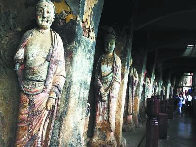 位于甘肃天水的麦积山石窟开凿在近百米的山崖峭壁上,图为麦积山石窟一处雕塑造像。新华社发