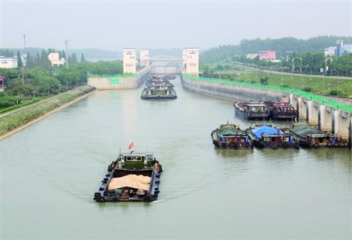 6月22日,装满货物的船只驶入京杭大运河山东枣庄台儿庄复线船闸 新华社发