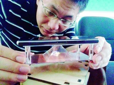 该创客团队的小伙伴揭秘:水晶球内部,有一个用透明硬质塑料片折成的空心锥体,形状看上去类似卢浮宫前的雕塑,通过4面塑料片的折射,手机屏幕上小鱼的影像投射下来,就呈现出了3D的效果。