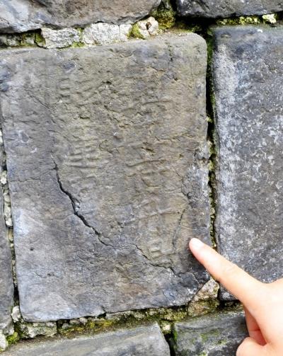 细细寻觅,记者从大砖上发现了古痕迹,砖面刻有两行字:上刻“镇江府丹阳县X记”,“X”模糊不清,像“董”字,但难以确定;下刻“堤工总局”。