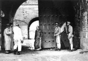 1937年“卢沟桥事变”后的第二天,在宛平城门口警戒的中国守军和入城的民众。