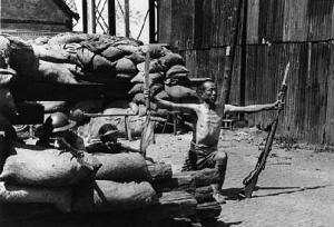 在与日军的对峙中,一名29军战士在阵前摆出蔑视敌人的姿势。
