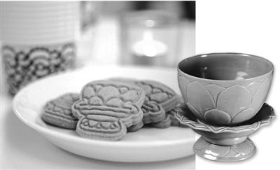现在面世的这款曲奇饼干,外盒采用苏州博物馆标志性的窗花造型,清爽淡雅;饼干表面的莲花造型,与秘色瓷莲花碗颇有几分神似;为了与文物的颜色和形状接近,饼干还选用了绿色的抹茶口味,有着轻微的弧度,看起来就像一只小碗的侧面。