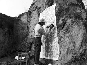 据了解,为摩崖石刻拓片首先要选纸,一般的宣纸还不行,棉性的为上。纸张选好后,将纸覆在碑石上捋平,用胶带固定,喷水,用棕老虎刷平。刷要有软硬功夫,轻了,不服帖;重了,纸头破碎。这样反复刷好几次,为了不致破坏碑刻,还有的地方要用皮榔头轻轻敲打。从湿到干,大约要1小时。拓片看似简单,却是一项艰苦细致的体力活,从拍打到补墨,一块四尺宣纸大小的碑刻,至少要认真拍打二三千次方能完成。