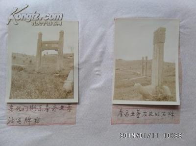 该调查报告篇幅不长,分为墓址、现状两部分,并配有“尧化门街东秦承业墓神道牌坊”和“秦承业墓左边的石碑”照片各一张。报告显示,秦承业墓位于南京栖霞区尧化门街东约1公里,距尧化门火车站不远。墓地正中有石牌坊一座,仅存中间一楹二柱,左右两柱倒在地上。解读这份报告并结合那张神道牌坊照片分析可知,这实际上是一座四柱三间冲天式石坊。牌坊正额上正书六字“秦文悫公墓道”。另一张照片则为墓地全景图。取景主要为了突出近前的一通石碑,照片中可以看见画面中间的牌坊,以及远端倒地的石构建。