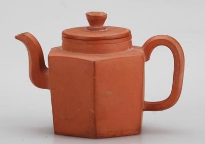 明万历·大彬款紫砂六方壶为红泥胎,有银砂闪点。壶圆口、短颈、折肩,壶身为六棱柱形,向下渐渐微收,平底内凹成圈足。壶平盖,子母口与壶身紧密结合,盖上置倒椎形纽,纽微倾斜,纽面印对合的半弧纹。壶身一侧附六棱形三弯流,另一侧附五棱形耳把,壶底竖刻阴文“大彬”楷书款。