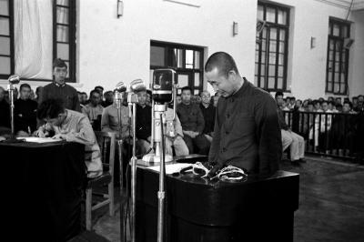 这是日本战犯菊地修一在法庭上(资料照片)。新华社发