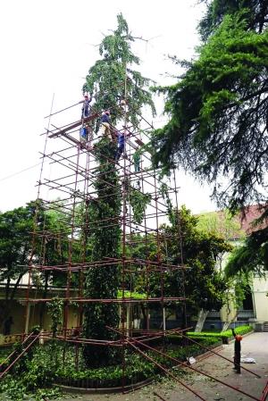 昨天下午3点,现代快报记者看到子超楼一侧已经搭起了近20米高的脚手架。工人们从上到下,一段段截锯着树干。截至昨天下午五点半,高约20米的雪松,被截掉了半个树身。