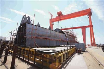 在丹东船舶重工基地造船船台上,一艘长81.38米、宽11.58米的战舰已经完成了船体甲板部分的建造,这是按照1:1的比例复制的“致远”纪念舰,未来她将停泊在大东沟沟口,成为博物馆的一部分。