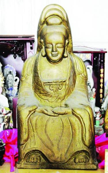 与此同时,两尊古石像的造型也颇为古朴。据目测,每尊大约0.8米高,与青石刻制的石碑颜色颇为相近。令人费解的是,好端端的两尊石像被村民送到宋帝庙后,被几位虔诚的佛教徒涂上了金粉调和漆,还美其名曰为“重塑金身”。