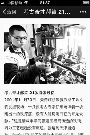 这是最近在微信朋友圈“疯传”的一篇“神文”。在这篇标题为《震惊:他生下来就已经5000岁神童郝笛,21岁身家过亿》的“神文”中,天津一名叫郝笛的年轻人被冠以“天才考古少年”的称号。不过,不少网友一边转发,一边发出质疑声,有的干脆在标题后面写上“求戳穿”。“天才”郝笛到底是何方神圣?记者多方联系郝笛未果,但找到了“发现”郝笛的记者、熟识郝笛的文物专家,通过他们,戳穿了一些“神话”,大致“考证”出一个“不是什么神”的郝笛。