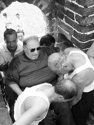 最后一段是十几级的陡峭台阶,三个壮汉小心翼翼抬着挤坐在轮椅中的贝大师,艰难穿过敌楼狭窄的门道,贝大师紧张得面色都有些难看了。有惊无险,贝大师终于登上了长城,遥望着远处渐渐消失在雾气中的长城,贝大师一直在问“当年是对着哪一边打仗的?”
