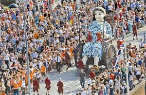 7月25日,在英国利物浦市,一个老奶奶巨型提线木偶在街头巡游。