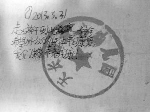从照片中可以看出,该涂鸦的文字内容为:“2013.3.31,赵文轩到此一游,希望外公的身体早日康复,我们全家幸福安康!”