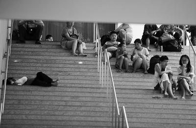 昨天上午,记者在中国科技馆看到不少游客坐在台阶上乘凉,有的脱了鞋,有的干脆“卧倒”了。张玉军摄 J217