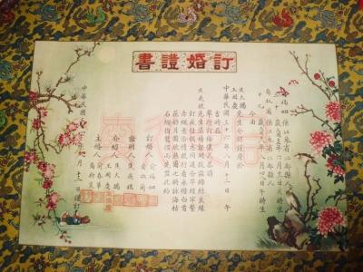 订婚证被老人珍藏在一个大红色的圆柱形纸筒里,纸筒约40厘米高,外面的红色依然鲜艳。打开纸筒,里面是卷成笔筒状的订婚证,铺展开来,是一张考究的纸,比现在常见的奖状要大一号。订婚证四周有龙凤图案,中间是文字,左右两边还有喜鹊、梅花之类的图案,一共两份,男女方各执一份。