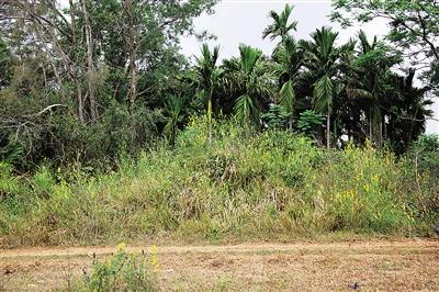 在万宁市后安镇桥头村南侧被称作“火烧墩”的一片荒坡上,偶见三两头水牛悠然地啃草,坡地上一条东西走向的羊肠小道右侧,有一个常年长满杂草的“土堆”,其实是一座古墓,只因每年清明节过后,多雨湿热的气候让植被快速生长,很快又遮盖了坟墓的原貌,加之看不到墓主的碑刻,自然让初来乍到者联想不到那里是一处坟茔。