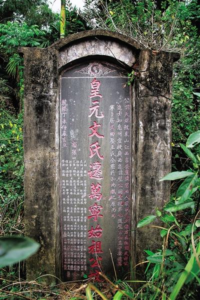 拨开荆棘,折断带刺的枝桠,绕到墓的后方——北面,终于看到一块高约2米、宽约60厘米、周边砌了灰泥的墓碑。墓碑上方正中间是一个“阴阳两仪”的图腾,周围有吉祥浮云的图案;碑心自上而下阴刻“皇元文氏迁万宁始祖公坟”,共11字。