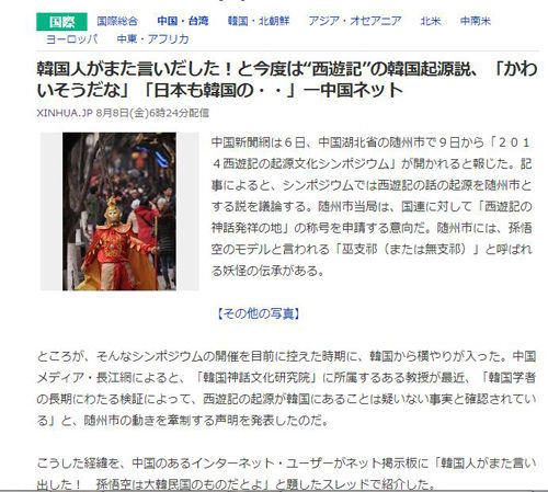 Xinhua.jp网站在日本当地时间8月8日上午6时24分发布题为《韩国人又说话了,这次是西游记的韩国起源说“太可怜了”“日本也是韩国的”中国网络(反应)》这篇文章的信息源有三个,中国新闻网的消息是介绍湖北随州的西游记研讨会,长江网的新闻则是韩国神话文化研究院学者发表声明表示抗议称“多年来韩国学者的研究证明,《西游记》起源于韩国”,韩方将视情派学者参加这次会议。