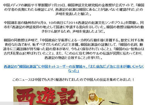 日本网络上关于此事的又一报道信息源也来自国内,报道称网易和千华新闻7月29日报道称,韩国神话文化研究院金教授在其个人主页刊文,其内容与上述的相同,认为西游记起源于韩国,有顺道寺和智异山传说为证。