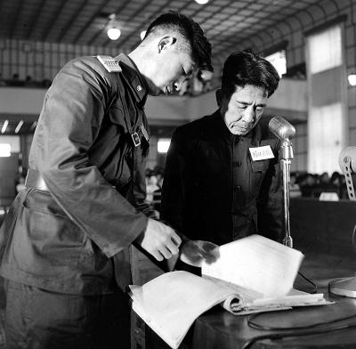 这是1956年被告人堀口正雄在供认了罪行后,法庭将证实他罪行的档案、证人证词、被害人控诉书等证据给他看。新华社发