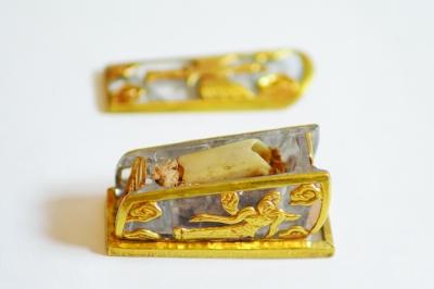据介绍,这批宝物大多出自内蒙古和蒙古边界的宝塔地宫,从棺、塔、瓶等几件承放品看,多为辽代之物。其中,以水晶镶足金飞天舍利棺和玛瑙骆驼最为殊胜。水晶镶嵌足金飞天棺由整块水晶雕刻而成,长约10厘米、宽4厘米、高6厘米,外部镶嵌足金祥云和飞天,既是装饰,又赋予整个棺柩轻盈灵动的感觉。棺内还装有舍利骨一枚,寓意吉祥。高培芝介绍,水晶棺、水晶塔等平时也可看到,但是,雕刻精细的水晶口沿外还贴金、包金、雕刻图案却是极稀少的。