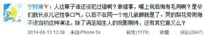 就在昨日中午,宁财神在微博发表观点,间接回应白岩松的评论,微博称:“人这辈子谁还没犯过错啊?做错事,嘴上说后悔有毛用啊?是爷们就长点儿记性争口气,以后不在同一个地儿崴脚就是了。哭得梨花带雨悔不该当初这种演法,除了满足陌生人的观影期待,还有其它意义么?”宗禾