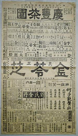 这张老戏报为竖开一版,竖长约56厘米,宽约31厘米,品相完好。戏报的上半部内容是唐山警世戏社乙班(二班)当天的演出剧目、演员介绍、演出时间、戏票价格等内容;戏报正中显著位置是当红评剧明星金苓芝的宣传广告;下半部分则是一些有关医疗及药品的广告,富有明显的时代感。