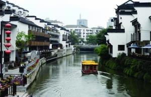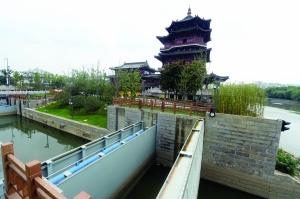 连接内外秦淮河的新河道,岸边仿古建筑为孙楚酒楼