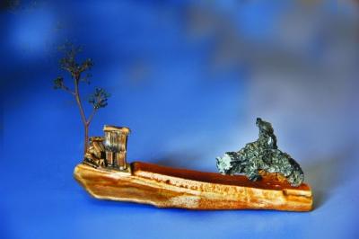 一个名叫黛玉葬花的作品也是两块石头组合而成,恰似头上有发髻的姑娘挑着一个小小的担子。另一个名叫垂钓的作品则是木石的组合,木质的船上有个正在垂钓的人,看起来意境幽远。“这是马航出事的时候做的名叫‘盼归’的作品。”这是几个人眺望远方,远方一艘船正在海里。他最满意的一个作品叫做“牧区货郎”,是取材自自己在新疆的援疆生活。“牧区商业不发达,全靠一个货郎送货,每次他都要徒步很远,然后把大家需要的东西记录下来,再去采购,非常辛苦。我看到这块石头,犹如一个人背着一个马褡子,就想到了他。”