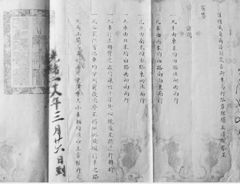 《各街车马行路章程》共分七条,主要内容为:一、凡车由东来,均由路北向西而行;二、凡车由西来,均由路南向东而行;三、凡车由南来,均由路东向北而行;四、凡车由北来,均由路西向南而行;五、凡车行至转弯之处,均让出十字街心绕过,不得径行转折;六、凡各家门首站车,均分列前后次序,不得并排,致碍行车之路;七、凡街上骑马、步行以及东洋车、大小车辆,均照以上章程行走。
