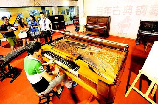 湖北日报讯 15日,在武汉徐东古玩城百年古典钢琴展上,钢琴师弹奏一架1866年的斯坦威钢琴,悠扬、浑厚的琴声让人如痴如醉。此次展演汇聚了1822年至1910年生产的9架世界名牌钢琴。在19日至21日举办的徐东古玩城第23届全国古玩收藏交易会上,这些钢琴将为观众演奏世界名曲。