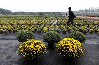 花木公司顺义赵全营基地,工作人员给新品菊花洒水。