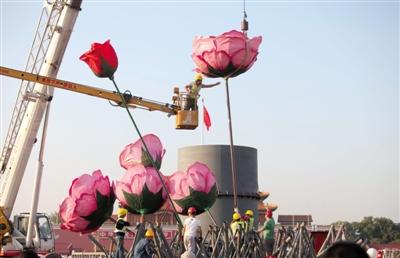 昨日,天安门广场,工作人员按照现场花篮模型布置国庆花篮。当天,主体花篮开始装花,预计25日完工。新京报记者 薛珺 摄