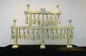 ▲良渚文化玉编钟。上下两层,榫卯结构,由19个编钟排列而成。陈可宁收藏。