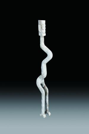 ▲三星堆曲线玉女人。龙溪菜色玉,高度:102cm,三星堆人像面具加双S曲折线组成。整玉雕琢,重心掌握精确。全身浅浮雕纹饰,经侵蚀而皮壳粗糙。周岳辉收藏。