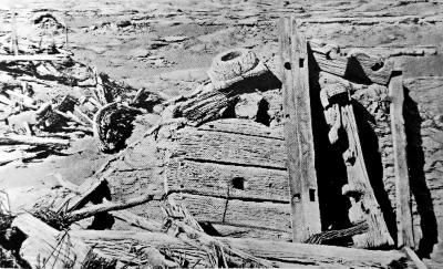 ▲楼兰古城被斯文·赫定发现时,“三间房”旁边散落的车轮和木简。