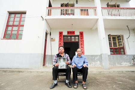 ↑在刘畴西烈士故居原址前,其侄孙和继子(右)捧着刘畴西的照片合影。