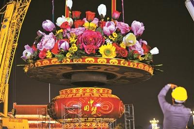 昨天下午,北京青年报记者来到天安门广场时,技术人员正在把最后几支仿真花“插放”到花篮中。晚上19点57分,随着一声哨响,重达60多吨的花篮,在两辆吊车的牵引下离开地面,缓缓吊起。每移动一小段距离,技术人员便吹响哨声“叫停”,调整花篮左右两侧的高度。历时近一个半小时,花篮成功吊装到篮体上,完成组装。