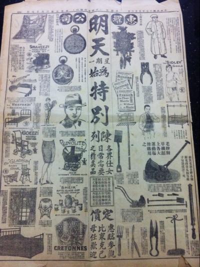 记者一一翻看了张玉顺带来的近百份报纸,不仅有民国时期的《申报》、《大公报》,也有建国初期的《中国少年报》,还有本地的《扬州日报》、《扬州市报》、《扬州晚报》。记者发现,年代最久远的是一份报纸为民国十七年五月六日(1928年)的《申报》,在这份报纸上,有一整版的购物信息,报纸醒目位置写有“惠罗公司,明天特别陈列”字样,从报纸上产品的配图来看,钟表、服装、农用工具、床、婴儿车等一应俱全。配图下方的文字内容也主要标识了该产品的原价与优惠价,这与现下流行的团购极为相似。