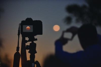 南京奥体中心,天文爱好者拍月食。 吴胜 摄