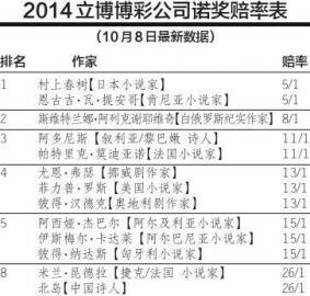 北京时间10月9日晚7点,将揭晓备受瞩目的2014年诺贝尔文学奖。在面纱揭开之前,各种分析预测喧嚣尘上,其中最吸引公众眼球的博彩公司的预测,则成为众人猜测所依循的一大线索。