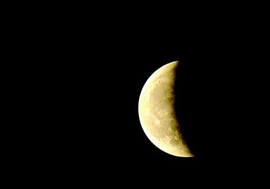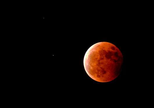 图为:昨晚7点34分左右,天空出现月全食现象,月亮没有消失,而是变成漂亮而神秘的“红月亮”奇观(左图)。晚8点后,月亮开始逐渐复圆。 (记者 倪娜 摄)