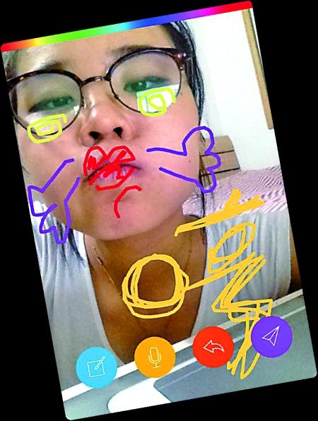 第四步:用手指在刚刚拍摄的图片上涂鸦,想更换画笔的颜色,可用手指在上方色调上滑动选取。点击画笔图示可录入文字,点击麦克风图示可录制语音,点击箭头图示可撤销涂鸦,涂鸦完成后,再点击飞机图示便可发送。