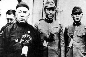 伪“蒙疆政府”主席德王(左)、伪“蒙疆政府”军总司令李守信(中)和日本占领军(资料图片)