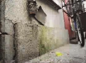 在挖掘现场,工作人员意外发现,在这块界碑旁边的另一户人家墙脚,还有一块果育堂界碑。它已成为墙脚一部分(见上图 杨建正 摄)。(记者 陈浩)